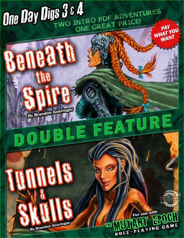 Return to a world of post-apocalyptic gonzo adventure with One Day Digs Double Feature 3 & 4! This evening’s first flick is irresistible, especially to those cyborgs in your team! Beneath the Spire will electrify your PCs, then, after a short intermission, dim the lights for Tunnels & Skulls, a post-apocalyptic random sewer generator!