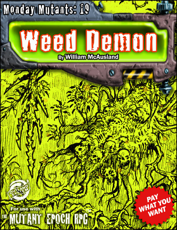 As with all Monday Mutants, you can mess with the weed demon’s stats for personal use and unleash these leafy predators using another game system. But please note that these flesh-eating veggies operate at their best when absorbing the fluids of player characters deployed in the fast-paced Outland System used by The Mutant Epoch RPG. Learn more about this well supported system by harvesting your free TME Quick Start Rules with the included 42 page adventure ‘Muddy Mayhem’ right here: